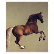 He was a self-taught artist, and with a profound knowledge of his subject, he then went on to become the foremost equestrian and animal painter of his day. Many of his paintings are fairly conventional studies of celebrated horses in the genre of the time. Others are more imaginative. Perhaps the most famous nowadays is the huge painting of the stallion “Whistlejacket” (1762)which hangs conspicuously in the National Gallery, London. This horse looks distorted, with head too small and legs too long for his magnificient body . Maybe Stubbs was deliberately exaggerating the proportions for overall purpose of expressing the character and impact of the animal.