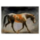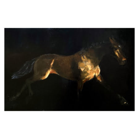 A thoroughbred horse at full gallop.  I am fascinated by the anatomy of the horse and wanted to focus on the highlights and colours of the chest and the accent of light on the stifle to create a dramatic and atmospheric painting.