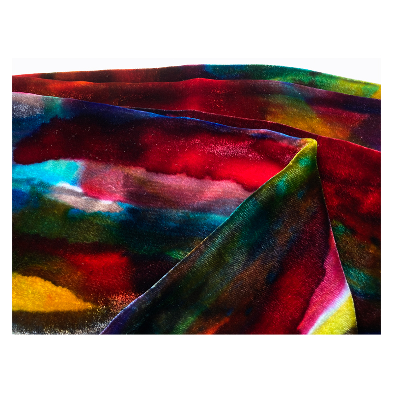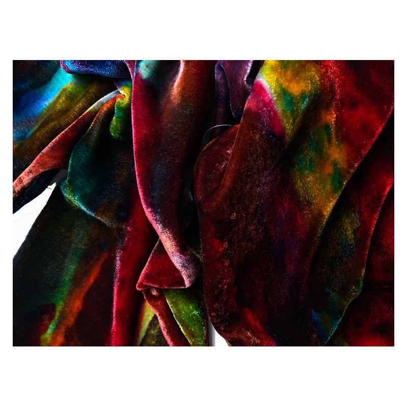 The colour effects in the light are subtle and spectacular. Each piece is totally unique and personally painted and finished by myself in my Scottish workshop, using wash-fast dyes that are completely absorbed into the texture of the material. The velvet is 15% silk and 85% viscose.
