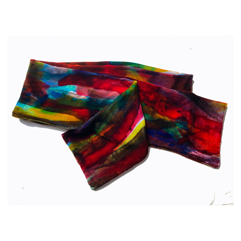 Exquisite and colourful hand-painted extra long double-weight velvet scarf by artist Diana Hand. 186 cm x 15 cm Beautiful abstract shapes in rich reds, darks and a flash of green and turquoise.