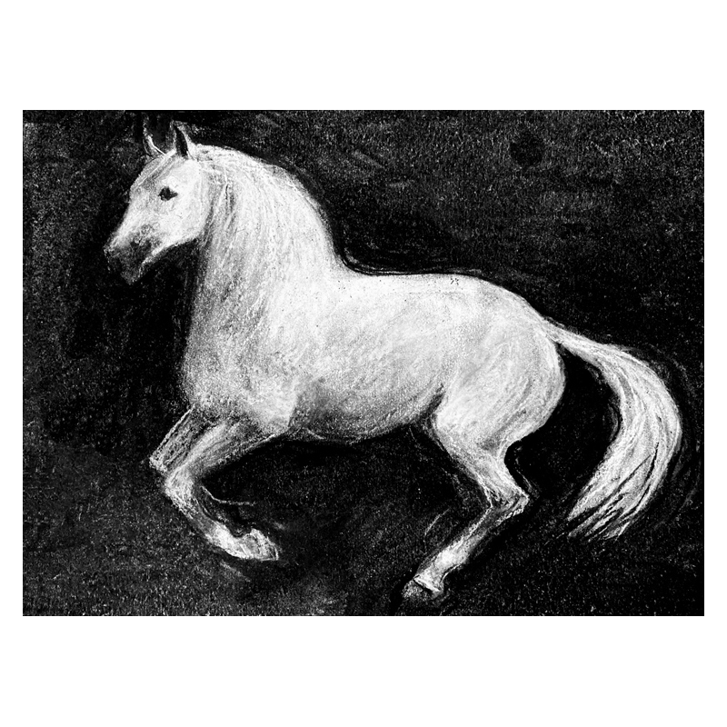 Charcoal and pastel study from a photograph by Keron Psillas Oliviera in her book “Lusitano”. I have made many studies of this subject. The horse is slightly twisted to the left in his position. I am a keen anatomist and often seek to establish that structure in order to make a free and expressive drawing. But it was a challenge in this case! I have made a larger version (800 x 600 mm) which will also be in the exhibition.