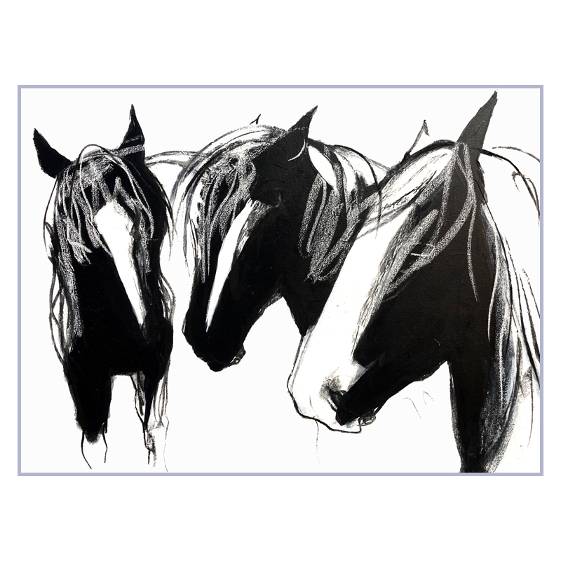 A dramatic interpretation of a family of three black and white horses. The mare is on the right and the others are her youngsters. There is something compelling about the patterning on the coats of these horses. I added the forelocks and manes as a softening feature.