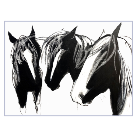 Charcoal and pastel study of a stable scene at the Royal Stables, Cordoba. I visited Cordoba in 2025 and was privileged to watch the riders and horses as they trained and exercised. In the evenings there is a formal display, but I really enjoyed the more relaxed and intimate atmosphere of the stables and practice sessions. The care and bond with horses and riders is very evident and special. These informal moments fascinate me. There is a smaller framed version of this subject: Image size 350 x 260 mm Framed size 410 x 320 mm.