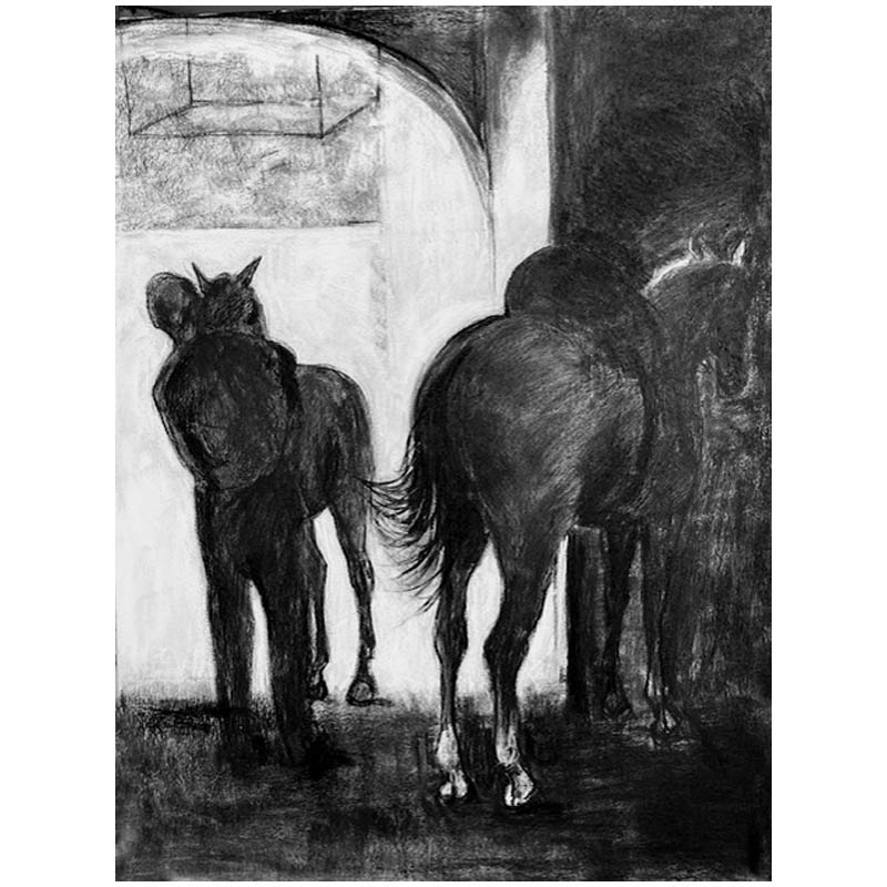 Charcoal and pastel study of a stable scene at the Royal Stables, Cordoba. I visited Cordoba in 2025 and was privileged to watch the riders and horses as they trained and exercised. In the evenings there is a formal display, but I really enjoyed the more relaxed and intimate atmosphere of the stables and practice sessions. The care and bond with horses and riders is very evident and special. These informal moments fascinate me. There is a smaller framed version of this subject: Image size 350 x 260 mm Framed size 410 x 320 mm.
