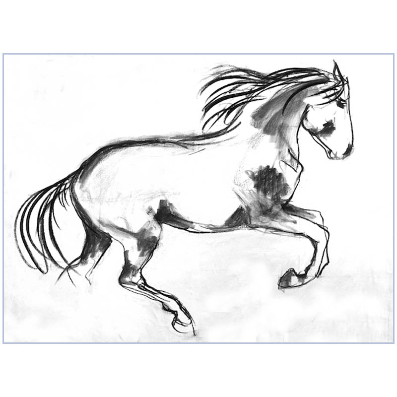 I am a keen anatomist and often seek to establish that structure in order to make a free and expressive drawing. In this case I was able to translate my understanding effectively to express the movement and physique of the horse. The original smaller drawing (Image size 290 x 390 mm, framed size 560 x 455) is available in the exhibition.