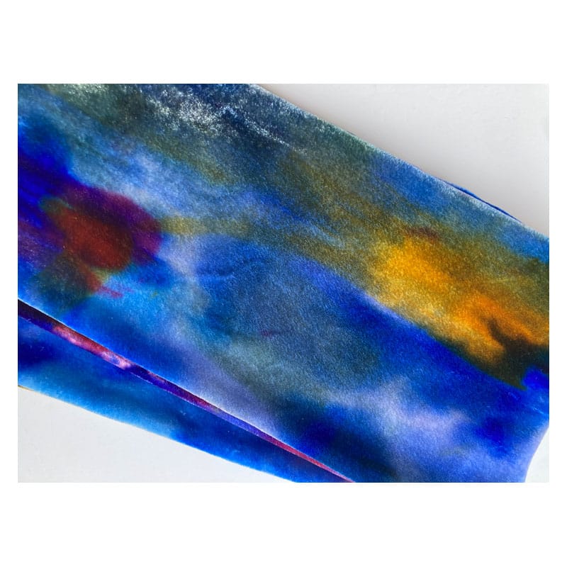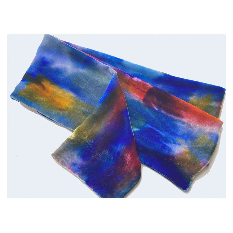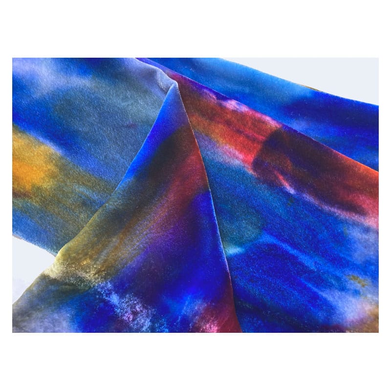 The colour effects in the light are subtle and spectacular. Each piece is totally unique and personally painted and finished by myself in my Scottish workshop, using wash-fast dyes that are completely absorbed into the texture of the material. The velvet is 15% silk and 85% viscose.