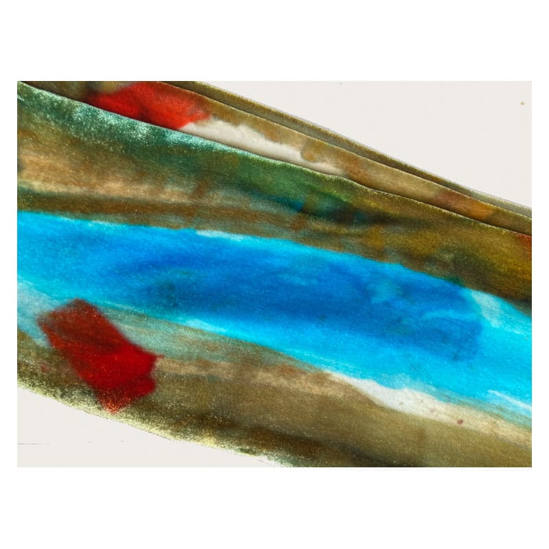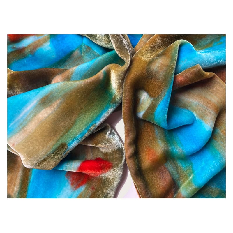The colour effects in the light are subtle and spectacular. Each piece is totally unique and personally painted and finished by myself in my Scottish workshop, using wash-fast dyes that are completely absorbed into the texture of the material. The velvet is 15% silk and 85% viscose.