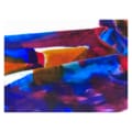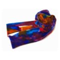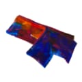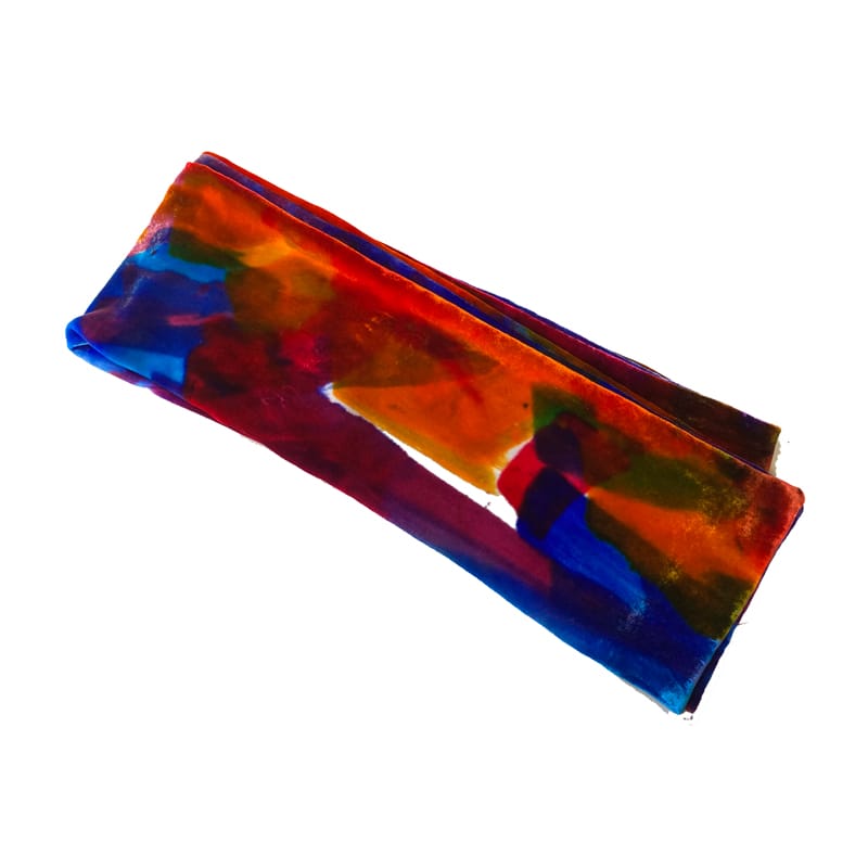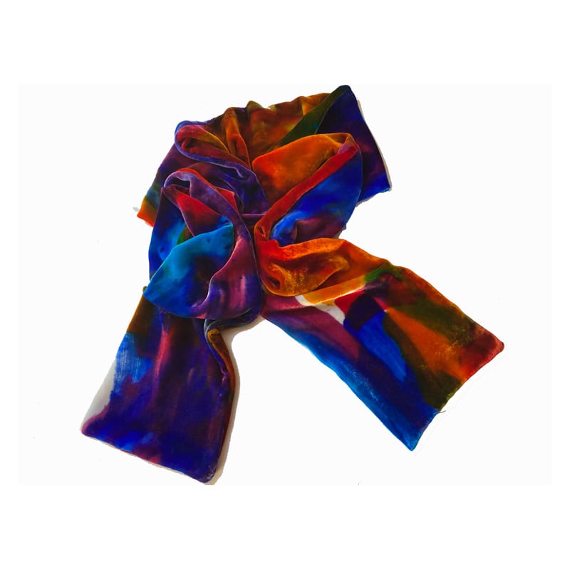 Exquisite and colourful hand-painted extra long double-weight velvet scarf by artist Diana Hand. 184 cm x 15 cm Fabulous painterly scarf inspired by oriental rugs. One side is warm golds and reds, the other mostly blues. Wear it how you wish.