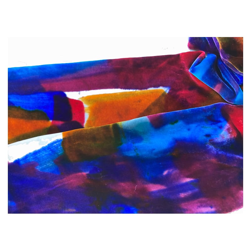 The colour effects in the light are subtle and spectacular. Each piece is totally unique and personally painted and finished by myself in my Scottish workshop, using wash-fast dyes that are completely absorbed into the texture of the material. The velvet is 15% silk and 85% viscose.
